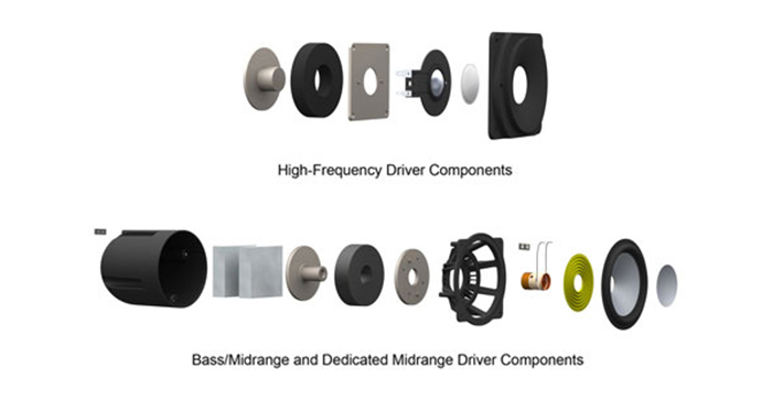 中低音單體的振膜也同樣采用陽極處理的鋁合金制成,質量輕而剛性高,擁有絕佳的阻尼特性,藉以發出清晰且能量豐沛的中低音。此外,該單體采長沖程設計,并搭載大型線圈,搭配elastomer彈性體制成的懸邊,相信在大音量下也可發出清晰音質。